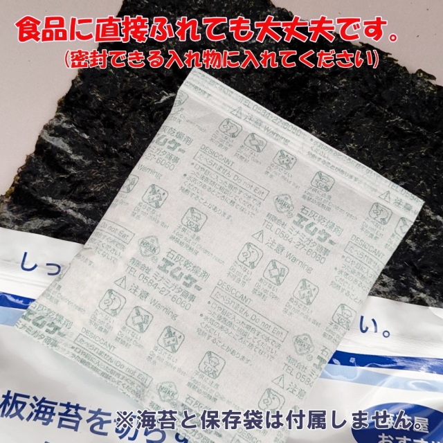 たとえば、 【1】食品の保存 海苔、乾燥野菜、お菓子、乾物などの湿気対策として。 開封後の袋に一緒に入れておくと、湿気を吸収して品質を保ちます。 食品の保存 海苔、乾燥野菜、お菓子、乾物などの湿気対策としてっ! 開封後の袋に一緒に入れておくと、湿気を吸収して品質を保ちます。 ペットフードの湿気・カビ防止にも便利です。 (直接触れて大丈夫です)(袋は密閉してください) 【2】靴・衣類・鞄などの湿気対策に。 クローゼットや靴箱に入れて、カビや臭いを防ぐために使えます。 特に梅雨時や湿気の多い地域で効果的。 【3】カメラやレンズの保管に。 カメラ機材は湿気に弱くカビが発生しやすいため、密閉ケースに石灰乾燥剤を入れて保管します。 【4】野菜の保存(脱湿) 野菜室や保存容器に入れると、余分な水分を吸い、鮮度を保ちやすくなります。